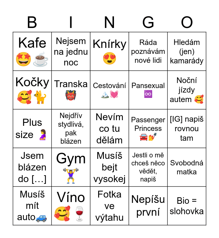This bingo card has a free space and 24 words: Gym 🏋️♀️, Víno 🥰🍷, Cestování 🏔️💓, Musíš mít auto🚙, Hledám (jen) kamarády, Kafe 🤩☕️, Kočky 🥰🐈, Nejsem na jednu noc, Passenger Princess 🚘💅, Musíš bejt vysokej, Pansexual ♾️, Plus size 🤰, Jestli o mě chceš něco vědět, napiš, Svobodná matka, Transka 👹, Nepíšu první, [IG] napiš rovnou tam, Knírky 😍, Noční jízdy autem 🥰, Nejdřív stydlivá, pak blázen, Bio = slohovka, Jsem blázen do […], Ráda poznávám nové lidi and Fotka ve výtahu.