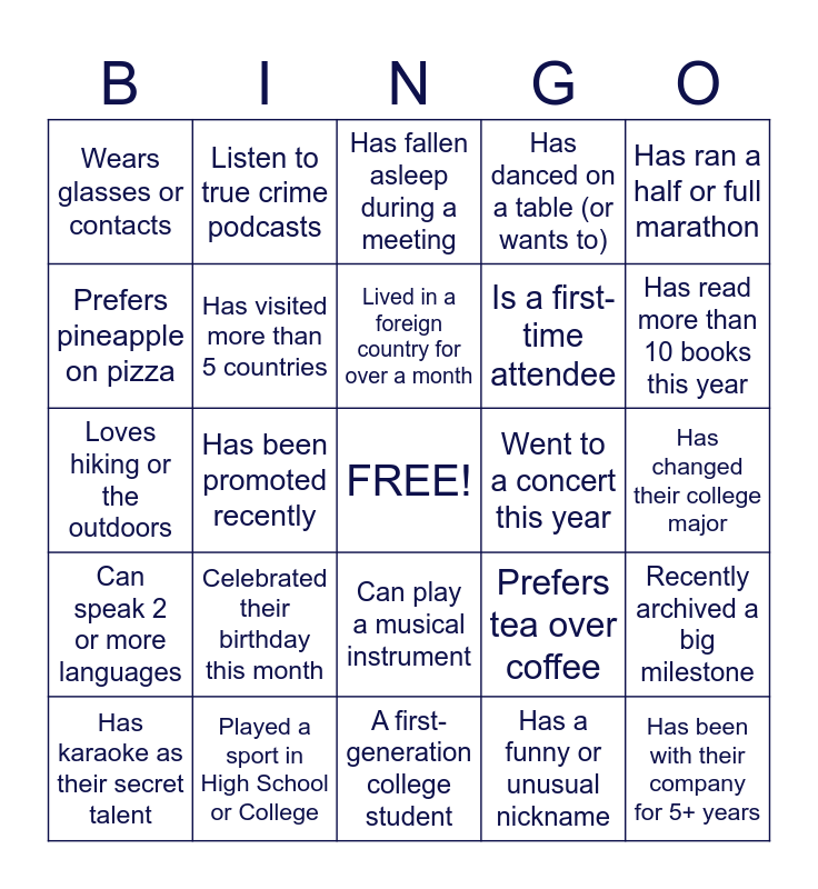 This bingo card has a free space and 24 words: Celebrated their birthday this month, Played a sport in High School or College, Lived in a foreign country for over a month, Has karaoke as their secret talent, Has ran a half or full marathon, Wears glasses or contacts, Prefers pineapple on pizza, Listen to true crime podcasts, Went to a concert this year, Can play a musical instrument, Is a first-time attendee, Loves hiking or the outdoors, Prefers tea over coffee, Recently archived a big milestone, Has visited more than 5 countries, Has a funny or unusual nickname, Has changed their college major, Has fallen asleep during a meeting, Has read more than 10 books this year, Has been promoted recently, Has been with their company for 5+ years, Can speak 2 or more languages, Has danced on a table (or wants to) and A first-generation college student.