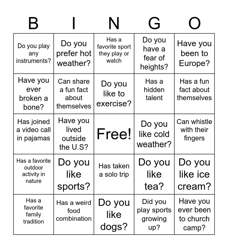 This bingo card has a free space and 47 words: Has a hidden talent, Have you ever been to church camp?, Do you eat breakfast every morning?, Do you like dogs?, Do you like sports?, Has a birthday in the same month as you, Do you prefer hot weather?, Have you been to Asia?, Have you ever broken a bone?, Do you have more then 1 sibling?, Can share a fun fact about themselves, Do you have a fear of heights?, Do you like ice cream?, Do you like tea?, Has a favorite family tradition, Do you own an animal?, Do you like to exercise?, Do you like cold weather?, Do you like chocolate?, Have you been to Europe?, Have you lived outside the U.S?, Did you play sports growing up?, Do you play any instruments?, Has a hidden talent ⠀⠀⠀⠀⠀⠀⠀, Has the same birthday month as you ⠀⠀⠀⠀⠀⠀⠀, Has a fun fact about themselves ⠀⠀⠀⠀⠀⠀⠀, Has a favorite family tradition ⠀⠀⠀⠀⠀⠀⠀, Has a favorite cartoon character or show ⠀⠀⠀⠀⠀⠀⠀, Has taken a solo trip ⠀⠀⠀⠀⠀⠀⠀, Has a favorite outdoor activity in nature ⠀⠀⠀⠀⠀⠀⠀, Can play a musical instrument ⠀⠀⠀⠀⠀⠀⠀, Remembers an embarassing moment ⠀⠀⠀⠀⠀⠀⠀, Has visited more than 5 countries ⠀⠀⠀⠀⠀⠀⠀, Has started a new hobby this year ⠀⠀⠀⠀⠀⠀⠀, Can touch their toes without bending knees ⠀⠀⠀⠀⠀⠀⠀, Has a weird food combination ⠀⠀⠀⠀⠀⠀⠀, Can whistle with their fingers ⠀⠀⠀⠀⠀⠀⠀, Has been on a roller coaster ⠀⠀⠀⠀⠀⠀⠀, Can name four constellations ⠀⠀⠀⠀⠀⠀⠀, Has a stuffed animal they sleep with ⠀⠀⠀⠀⠀⠀⠀, Has a tattoo ⠀⠀⠀⠀⠀⠀⠀, Has a favorite sport they play or watch ⠀⠀⠀⠀⠀⠀⠀, Has joined a video call in pajamas ⠀⠀⠀⠀⠀⠀⠀, Has read a book this month ⠀⠀⠀⠀⠀⠀⠀, Has a good piece of advice they received ⠀⠀⠀⠀⠀⠀⠀, Remembers a recurring dream ⠀⠀⠀⠀⠀⠀⠀ and Has a favorite memory with their family ⠀⠀⠀⠀⠀⠀⠀.