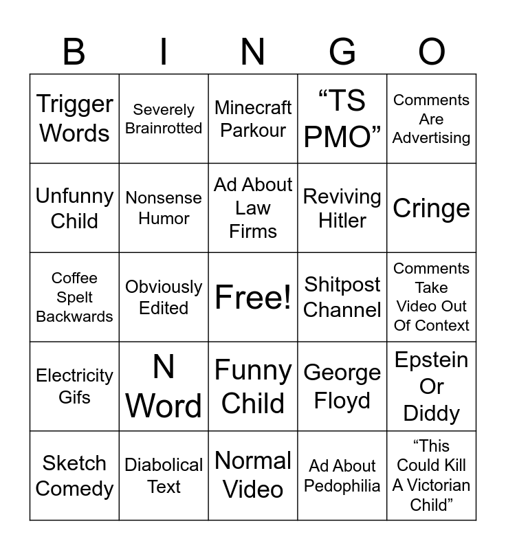This bingo card has a free space and 24 words: N Word, Diabolical Text, Ad About Law Firms, Sketch Comedy, Comments Are Advertising, Trigger Words, Unfunny Child, Severely Brainrotted, Shitpost Channel, Funny Child, Reviving Hitler, Coffee Spelt Backwards, George Floyd, Epstein Or Diddy, Nonsense Humor, Ad About Pedophilia, Comments Take Video Out Of Context, Minecraft Parkour, Cringe, Obviously Edited, “This Could Kill A Victorian Child”, Electricity Gifs, “TS PMO” and Normal Video.