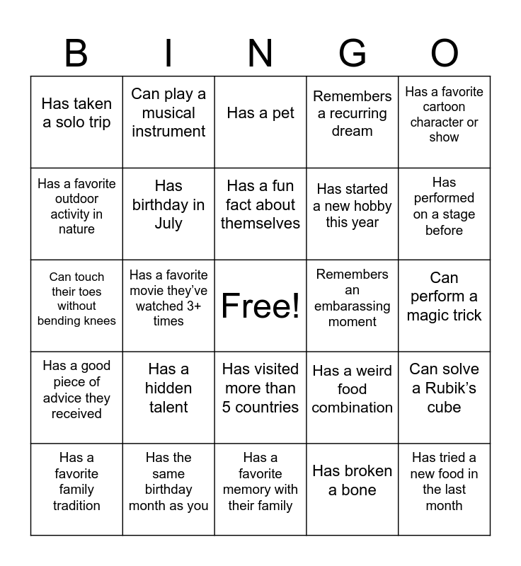 This bingo card has a free space and 24 words: Has a hidden talent ⠀⠀⠀⠀⠀⠀⠀, Has the same birthday month as you ⠀⠀⠀⠀⠀⠀⠀, Has a fun fact about themselves ⠀⠀⠀⠀⠀⠀⠀, Has a favorite family tradition ⠀⠀⠀⠀⠀⠀⠀, Has a favorite cartoon character or show ⠀⠀⠀⠀⠀⠀⠀, Has taken a solo trip ⠀⠀⠀⠀⠀⠀⠀, Has a favorite outdoor activity in nature ⠀⠀⠀⠀⠀⠀⠀, Can play a musical instrument ⠀⠀⠀⠀⠀⠀⠀, Remembers an embarassing moment ⠀⠀⠀⠀⠀⠀⠀, Has visited more than 5 countries ⠀⠀⠀⠀⠀⠀⠀, Has started a new hobby this year ⠀⠀⠀⠀⠀⠀⠀, Can touch their toes without bending knees ⠀⠀⠀⠀⠀⠀⠀, Has a weird food combination ⠀⠀⠀⠀⠀⠀⠀, Can solve a Rubik’s cube ⠀⠀⠀⠀⠀⠀⠀, Has birthday in July ⠀⠀⠀⠀⠀⠀⠀, Has broken a bone ⠀⠀⠀⠀⠀⠀⠀, Can perform a magic trick ⠀⠀⠀⠀⠀⠀⠀, Has a pet ⠀⠀⠀⠀⠀⠀⠀, Has performed on a stage before ⠀⠀⠀⠀⠀⠀⠀, Has a favorite movie they’ve watched 3+ times ⠀⠀⠀⠀⠀⠀⠀, Has tried a new food in the last month ⠀⠀⠀⠀⠀⠀⠀, Has a good piece of advice they received ⠀⠀⠀⠀⠀⠀⠀, Remembers a recurring dream ⠀⠀⠀⠀⠀⠀⠀ and Has a favorite memory with their family ⠀⠀⠀⠀⠀⠀⠀.