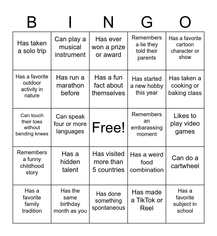 This bingo card has a free space and 24 words: Has a hidden talent ⠀⠀⠀⠀⠀⠀⠀, Has the same birthday month as you ⠀⠀⠀⠀⠀⠀⠀, Has a fun fact about themselves ⠀⠀⠀⠀⠀⠀⠀, Has a favorite family tradition ⠀⠀⠀⠀⠀⠀⠀, Has a favorite cartoon character or show ⠀⠀⠀⠀⠀⠀⠀, Has taken a solo trip ⠀⠀⠀⠀⠀⠀⠀, Has a favorite outdoor activity in nature ⠀⠀⠀⠀⠀⠀⠀, Can play a musical instrument ⠀⠀⠀⠀⠀⠀⠀, Remembers an embarassing moment ⠀⠀⠀⠀⠀⠀⠀, Has visited more than 5 countries ⠀⠀⠀⠀⠀⠀⠀, Has started a new hobby this year ⠀⠀⠀⠀⠀⠀⠀, Can touch their toes without bending knees ⠀⠀⠀⠀⠀⠀⠀, Has a weird food combination ⠀⠀⠀⠀⠀⠀⠀, Can do a cartwheel ⠀⠀⠀⠀⠀⠀⠀, Has run a marathon before ⠀⠀⠀⠀⠀⠀⠀, Has made a TikTok or Reel ⠀⠀⠀⠀⠀⠀⠀, Likes to play video games ⠀⠀⠀⠀⠀⠀⠀, Has ever won a prize or award ⠀⠀⠀⠀⠀⠀⠀, Has taken a cooking or baking class ⠀⠀⠀⠀⠀⠀⠀, Can speak four or more languages ⠀⠀⠀⠀⠀⠀⠀, Has a favorite subject in school ⠀⠀⠀⠀⠀⠀⠀, Remembers a funny childhood story ⠀⠀⠀⠀⠀⠀⠀, Remembers a lie they told their parents ⠀⠀⠀⠀⠀⠀⠀ and Has done something spontaneous ⠀⠀⠀⠀⠀⠀⠀.