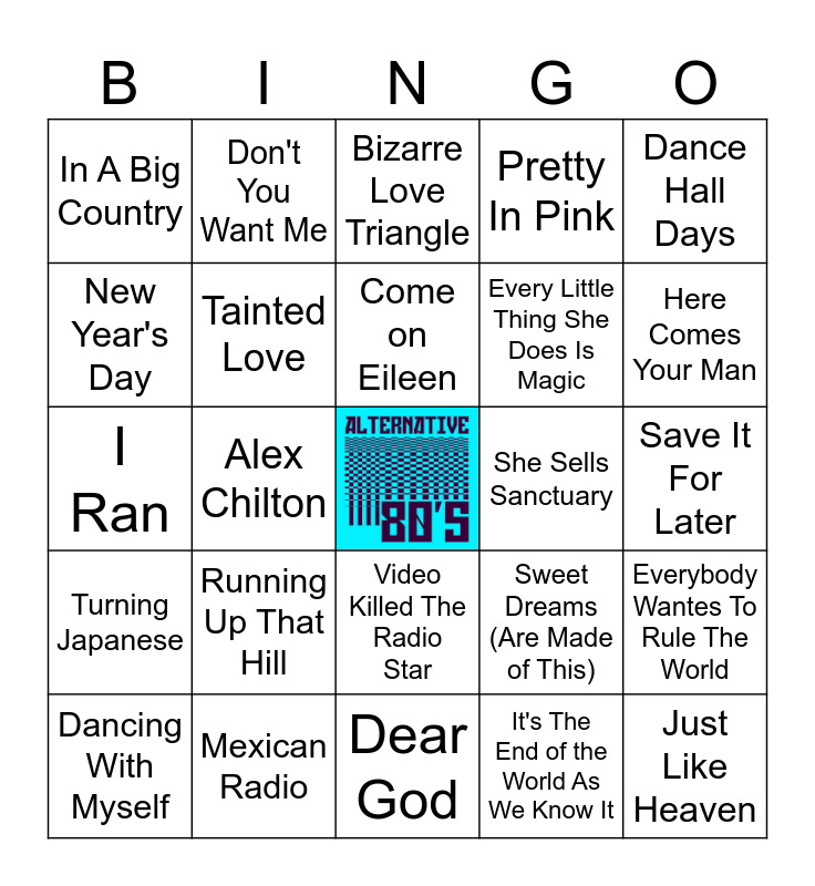 This bingo card has a free space and 53 words: Blister In The Sun, Just Like Heaven, Once In A Lifetime, It's The End of the World As We Know It, Running Up That Hill, Whip It, Don't You Want Me, I Melt With You, New Year's Day, Don't Change, Tainted Love, West End Girls, Everybody Wantes To Rule The World, Sweet Dreams (Are Made of This), Rock The Casbah, Dancing With Myself, Come on Eileen, She Sells Sanctuary, Tempted, Dance Hall Days, Alex Chilton, Take On Me, Every Little Thing She Does Is Magic, In A Big Country, Rio, Mexican Radio, People Are People, Tenderness, Lips Like Sugar, Here Comes Your Man, Dead Man's Party, Radio GaGa, She Drives Me Crazy, Our House, Jane Says, Love Will Tear Us Apart, Pretty In Pink, Dear God, Bizarre Love Triangle, Game Without Frontiers, Love My Way, A Town Called Malice, Save It For Later, Smalltown Boy, Common People, Video Killed The Radio Star, Oh Yeah, Rock Lobster, I Ran, Turning Japanese, How Soon Is Now?, Modern Love and Under The Milky Way.