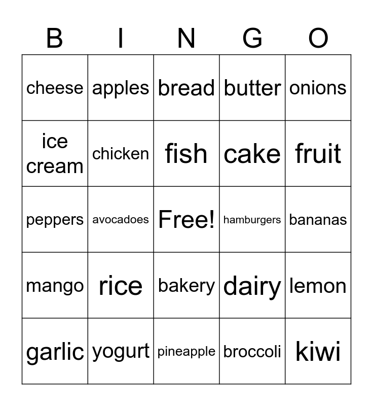 This bingo card has a free space and 34 words: meat, broccoli, carrots, produce, mango, chicken, onions, garlic, apples, oranges, fish, bread, pasta, flour, hamburgers, fruit, yogurt, peppers, rice, dairy, bakery, eggs, cheese, bananas, pineapple, kiwi, butter, potatoes, cake, ice cream, tomatoes, avocadoes, lemon and watermelon.