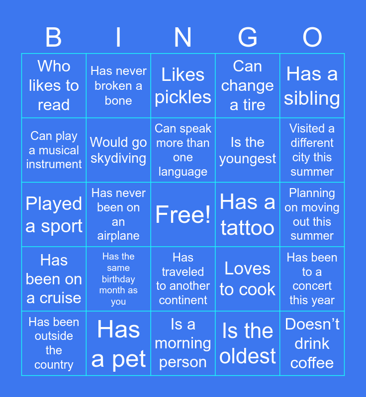 This bingo card has a free space and 24 words: Has the same birthday month as you, Has a pet, Can speak more than one language, Has been outside the country, Has a sibling, Who likes to read, Can play a musical instrument, Has never broken a bone, Has a tattoo, Has traveled to another continent, Is the youngest, Played a sport, Loves to cook, Has been to a concert this year, Would go skydiving, Is the oldest, Planning on moving out this summer, Likes pickles, Visited a different city this summer, Has never been on an airplane, Doesn’t drink coffee, Has been on a cruise, Can change a tire and Is a morning person.