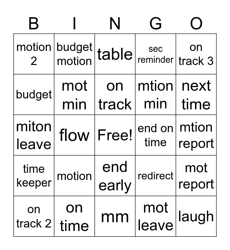 This bingo card has a free space and 24 words: motion, on time, on track, on track 2, on track 3, motion 2, budget, budget motion, end on time, end early, mtion min, miton leave, redirect, mot report, mot min, mot leave, mtion report, table, next time, flow, laugh, time keeper, sec reminder and mm.