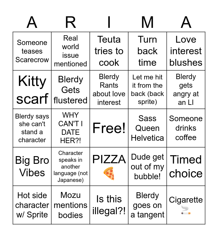 This bingo card has a free space and 29 words: Hot side character w/ Sprite, Cat attacks Scarecrow, WHY CAN'T I DATE HER?!, Character Sprite with weird outfit change, Someone teases Scarecrow, Teuta tries to cook, Blerdy Gets flustered, Character speaks in another language (not Japanese), Sass Queen Helvetica, Mozu mentions bodies, Someone drinks coffee, Cigarette 🚬, Is this illegal?!, Blerdy goes on a tangent, Blerdy gets angry at an LI, Legal jargon, PIZZA 🍕, Big Bro Vibes, Love interest blushes, Blerdy says she can't stand a character, Dude get out of my bubble!, Extended background shot, Let me hit it from the back (back sprite), Kitty scarf, Turn back time, Real world issue mentioned, Timed choice, Blerdy Rants about love interest and cellphone call screen.