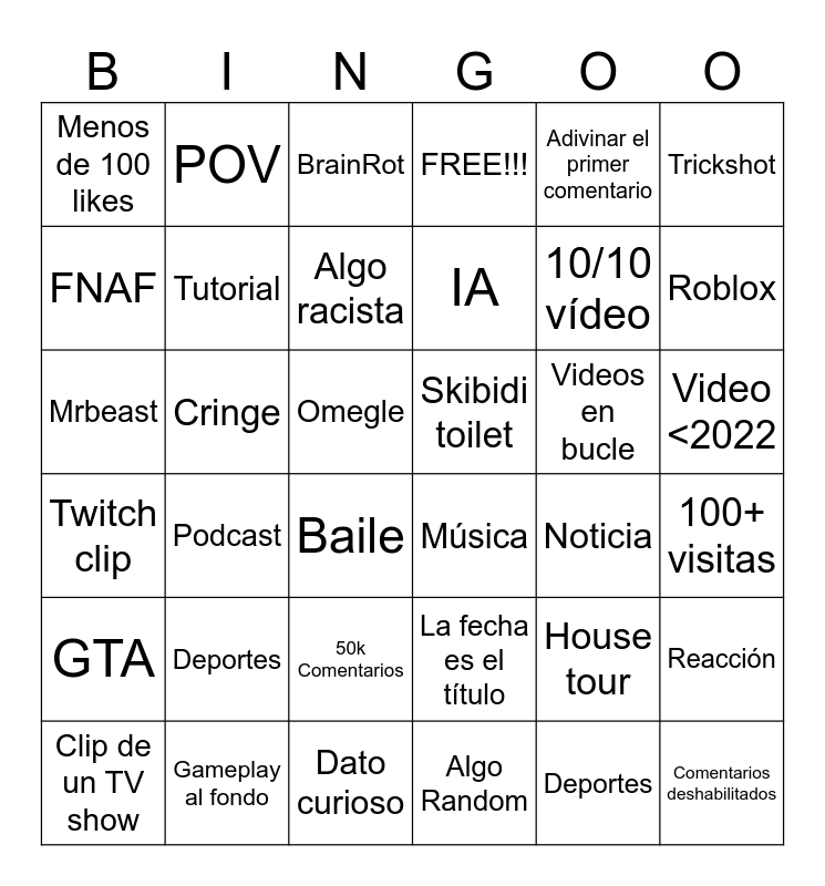 This bingo card has 42 words: Deportes, Tutorial, Video satisfactorio, Videos en bucle, 100+ visitas, Podcast, Mrbeast, Subway surfers, BrainRot, Video <2022, Omegle, IA, Roblox, Adivinar el primer comentario, Gameplay al fondo, Twitch clip, Reacción, 10/10 vídeo, Comentarios deshabilitados, POV, Trickshot, 50k Comentarios, GTA, Menos de 100 likes, Adivinar sig vídeo, Clip de un TV show, Algo racista, NSFW, Deportes, House tour, Torres gemelas, Skibidi toilet, FNAF, Noticia, Dato curioso, Baile, Música, Cringe, La fecha es el título, Algo Random, FREE!!! and Trollface.