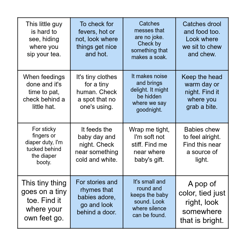 This bingo card has 17 words: It's small and round and keeps the baby sound. Look where silence can be found., This tiny thing goes on a tiny toe. Find it where your own feet go., Catches messes that are no joke. Check by something that makes a soak., This little guy is hard to see, hiding where you sip your tea., It feeds the baby day and night. Check near something cold and white., Catches drool and food too. Look where we sit to chew and chew., Babies chew to feel alright. Find this near a source of light., It makes noise and brings delight. It might be hidden where we say goodnight., Keep the head warm day or night. Find it where you grab a bite., It's tiny clothes for a tiny human. Check a spot that no one's using., For stories and rhymes that babies adore, go and look behind a door., Wrap me tight, I'm soft not stiff. Find me near where baby's gift., When feedings done and it's time to pat, check behind a little hat., To check for fevers, hot or not, look where things get nice and hot., For sticky fingers or diaper duty, I'm tucked behind the diaper booty., When baby sleeps here you do not frown, find it where you go up and down. and A pop of color, tied just right, look somewhere that is bright..