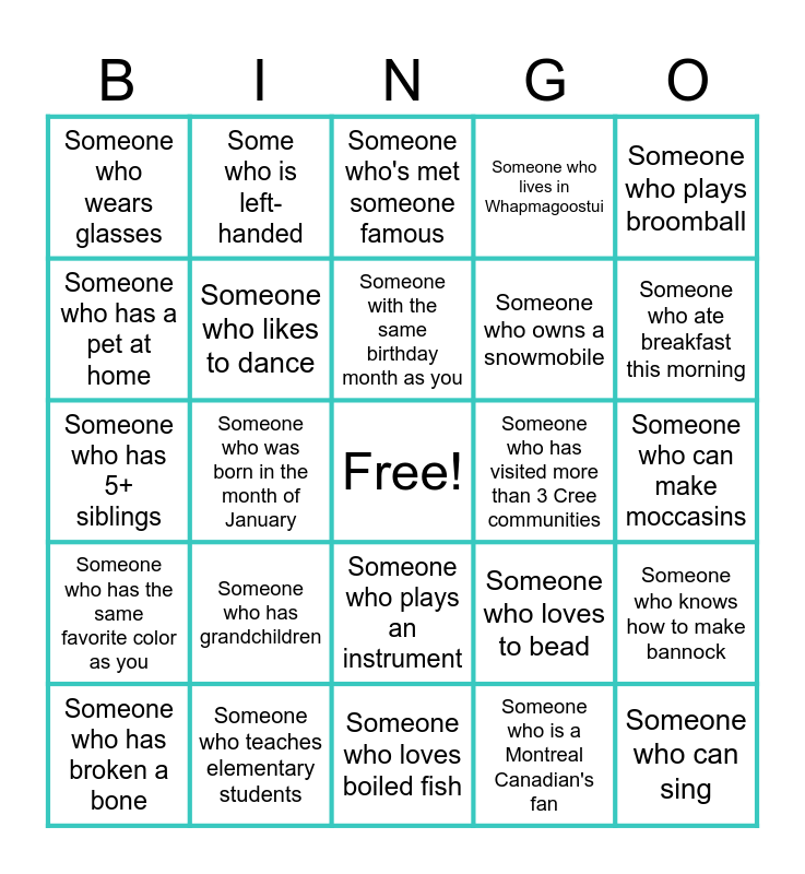 This bingo card has a free space and 24 words: Someone who has grandchildren, Someone who teaches elementary students, Someone with the same birthday month as you, Someone who has broken a bone, Someone who plays broomball, Someone who wears glasses, Someone who has a pet at home, Some who is left-handed, Someone who has visited more than 3 Cree communities, Someone who plays an instrument, Someone who owns a snowmobile, Someone who has 5+ siblings, Someone who loves to bead, Someone who knows how to make bannock, Someone who likes to dance, Someone who is a Montreal Canadian's fan, Someone who can make moccasins, Someone who's met someone famous, Someone who ate breakfast this morning, Someone who was born in the month of January, Someone who can sing, Someone who has the same favorite color as you, Someone who lives in Whapmagoostui and Someone who loves boiled fish.