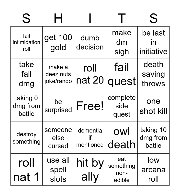 This bingo card has a free space and 24 words: someone else cursed, use all spell slots, roll nat 20, roll nat 1, be last in initiative, fail intimidation roll, take fall dmg, get 100 gold, complete side quest, dementia if mentioned, fail quest, taking 0 dmg from battle, owl death, taking 10 dmg from battle, make a deez nuts joke/rando, eat something non-edible, one shot kill, dumb decision, death saving throws, be surprised, low arcana roll, destroy something, make dm sigh and hit by ally.