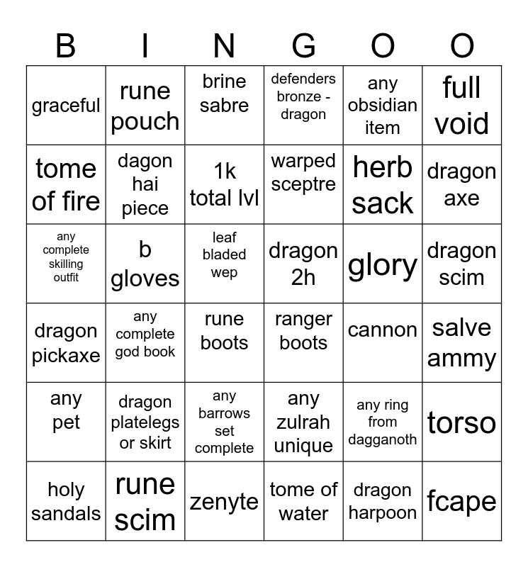 This bingo card has 36 words: any zulrah unique, any barrows set complete, tome of water, tome of fire, dragon pickaxe, dragon 2h, dagon hai piece, zenyte, any obsidian item, any ring from dagganoth, dragon axe, defenders bronze - dragon, torso, b gloves, warped sceptre, graceful, any pet, glory, any complete skilling outfit, brine sabre, leaf bladed wep, any complete god book, ranger boots, rune boots, cannon, rune pouch, herb sack, rune scim, 1k total lvl, full void, fcape, holy sandals, salve ammy, dragon scim, dragon platelegs or skirt and dragon harpoon.