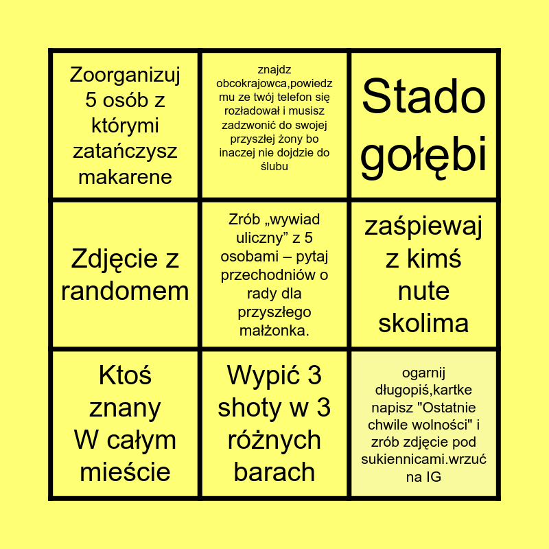 This bingo card has a free space and 24 words: Zrobić 5 selfie z różnymi obcymi dziewczynami i wrzucić to na instastory oznaczając je, Wymienić się z kimś ubraniem i zrobić zdjęcie, Wypić 3 shoty w 3 różnych barach, Nagraj z kimś tanecznego tiktoka, ogarnij długopiś,kartke napisz "Ostatnie chwile wolności" i zrób zdjęcie pod sukiennicami.wrzuć na IG, Zoorganizuj 5 osób z którymi zatańczysz makarene, zaśpiewaj z kimś nute skolima, znajdz obcokrajowca,powiedz mu ze twój telefon się rozładował i musisz zadzwonić do swojej przyszłej żony bo inaczej nie dojdzie do ślubu, Scooter kidy, Para Dziadków, Płaczące dziecko, Korek, Park, Osoba czarnoskóra, Ktoś znany W całym mieście, Kwiaty, Lody, Stado gołębi, Pokemony (Anime ludzie xd), Rozmowa z kimś w innym języku, Random żółwik, Ruiny, Zdjęcie z randomem and Powiedz komuś komplement.