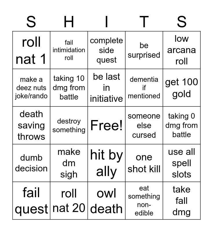 This bingo card has a free space and 24 words: make dm sigh, roll nat 20, be last in initiative, fail quest, low arcana roll, roll nat 1, make a deez nuts joke/rando, fail intimidation roll, someone else cursed, hit by ally, dementia if mentioned, death saving throws, one shot kill, use all spell slots, taking 10 dmg from battle, eat something non-edible, taking 0 dmg from battle, complete side quest, get 100 gold, destroy something, take fall dmg, dumb decision, be surprised and owl death.