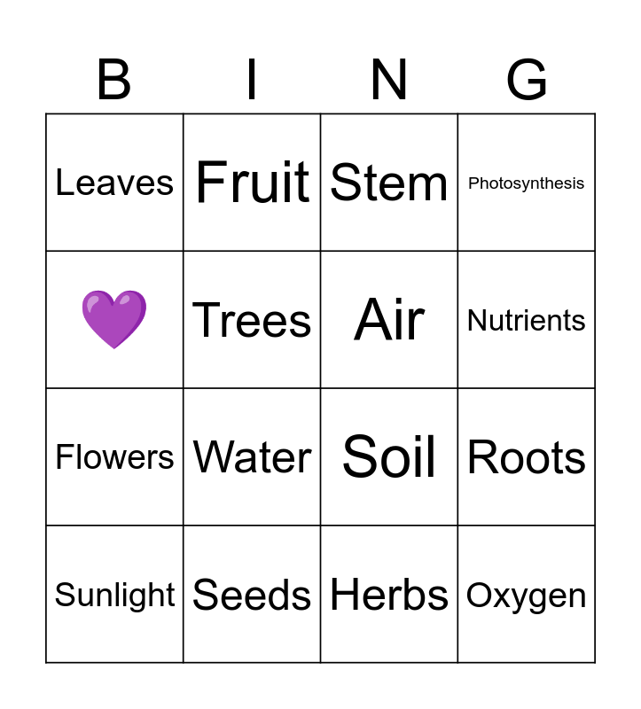 This bingo card has 16 words: Seeds, Roots, Stem, Leaves, Flowers, Fruit, Soil, Herbs, 💜, Trees, Sunlight, Photosynthesis, Water, Nutrients, Air and Oxygen.