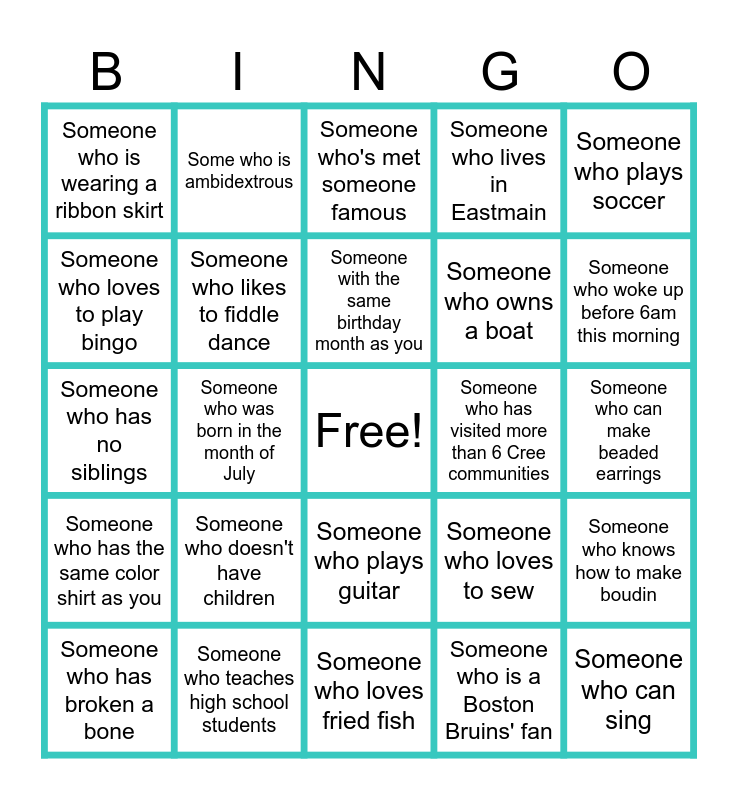 This bingo card has a free space and 24 words: Someone who doesn't have children, Someone who teaches high school students, Someone with the same birthday month as you, Someone who has broken a bone, Someone who plays soccer, Someone who is wearing a ribbon skirt, Someone who loves to play bingo, Some who is ambidextrous, Someone who has visited more than 6 Cree communities, Someone who plays guitar, Someone who owns a boat, Someone who has no siblings, Someone who loves to sew, Someone who knows how to make boudin, Someone who likes to fiddle dance, Someone who is a Boston Bruins' fan, Someone who can make beaded earrings, Someone who's met someone famous, Someone who woke up before 6am this morning, Someone who was born in the month of July, Someone who can sing, Someone who has the same color shirt as you, Someone who lives in Eastmain and Someone who loves fried fish.