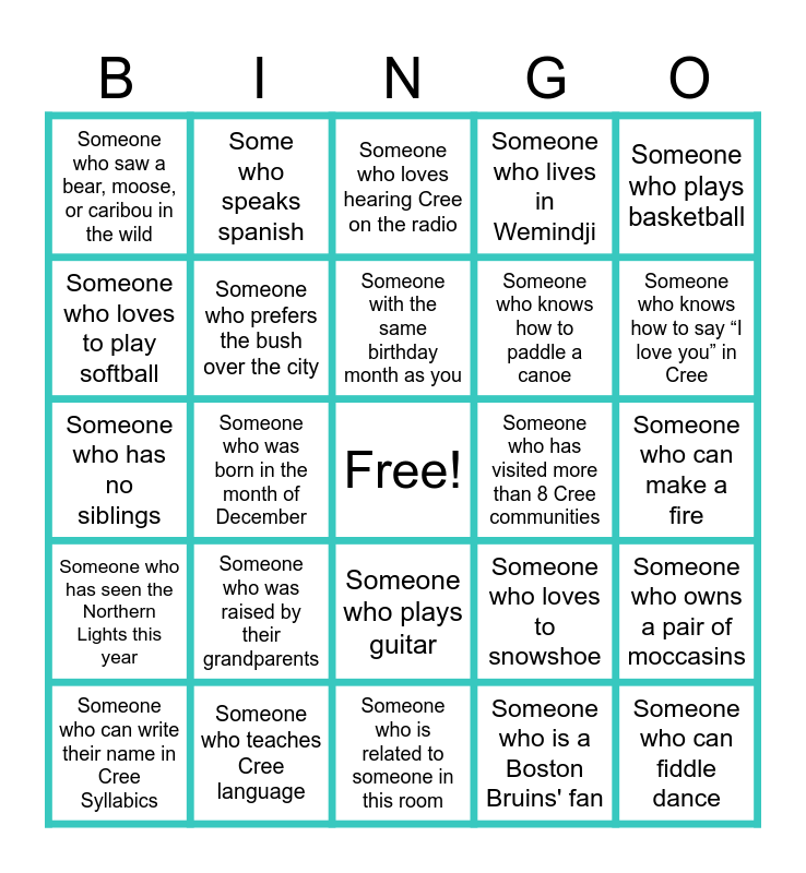 This bingo card has a free space and 24 words: Someone who was raised by their grandparents, Someone who teaches Cree language, Someone with the same birthday month as you, Someone who can write their name in Cree Syllabics, Someone who plays basketball, Someone who saw a bear, moose, or caribou in the wild, Someone who loves to play softball, Some who speaks spanish, Someone who has visited more than 8 Cree communities, Someone who plays guitar, Someone who knows how to paddle a canoe, Someone who has no siblings, Someone who loves to snowshoe, Someone who owns a pair of moccasins, Someone who prefers the bush over the city, Someone who is a Boston Bruins' fan, Someone who can make a fire, Someone who loves hearing Cree on the radio, Someone who knows how to say “I love you” in Cree, Someone who was born in the month of December, Someone who can fiddle dance, Someone who has seen the Northern Lights this year, Someone who lives in Wemindji and Someone who is related to someone in this room.