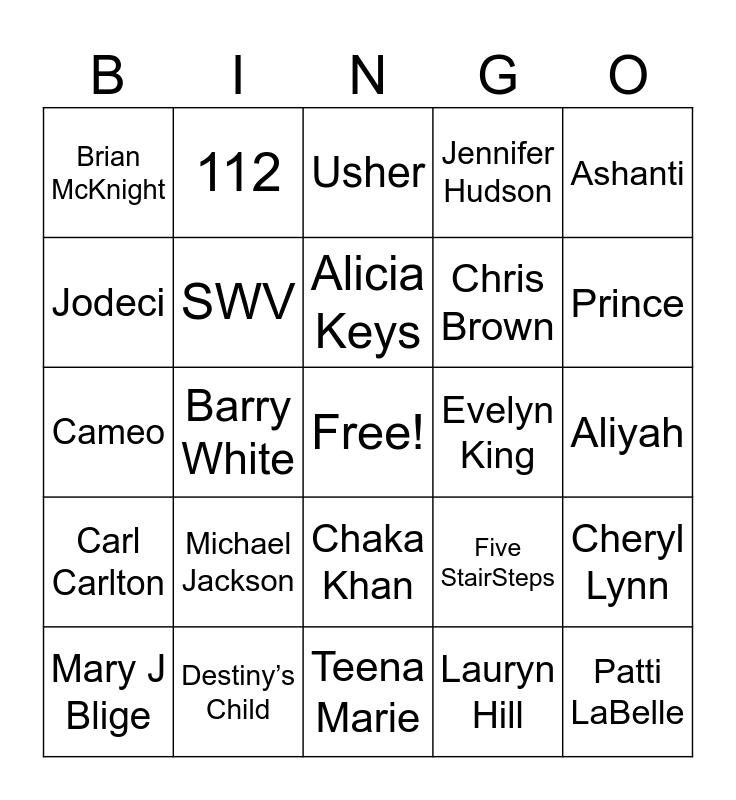 This bingo card has a free space and 44 words: Fantasia, Patti LaBelle, Glady’s Knight, Mary J Blige, Trey Songz, Lauryn Hill, Usher, Ginuwine, Ashanti, Destiny’s Child, Jennifer Hudson, Evelyn King, Chaka Khan, Michael Jackson, Lootha Vandross, Teena Marie, Maze & Frankie Beverly, Cameo, Keyshia cole, Prince, 112, Avant, Boyz II Men, Brian McKnight, Marvin Gaye, Aliyah, TLC, Bill Withers, Five StairSteps, Carl Carlton, Aretha Franklin, Cheryl Lynn, The Isley Brothers, Sunshine Anderson, Barry White, Bell Biv DeVoe, D'Angelo, Shai, Alicia Keys, Jodeci, Chris Brown, Bruno Mars, SWV and Maxwell.