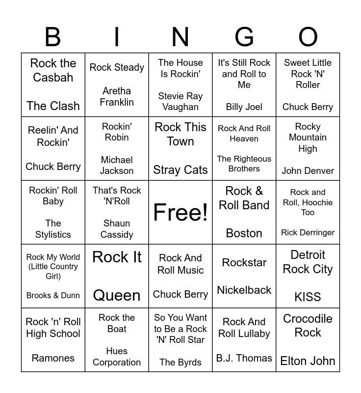 This bingo card has a free space and 79 words: Rockin' in the Free World Neil Young, Rock and Roll Led Zeppelin, The House Is Rockin' Stevie Ray Vaughan, Life Is a Rock Reunion, R.O.C.K. In The U.S.A. John Mellencamp, Rockin' The Paradise Styx, Rock And Roll Music Chuck Berry, Rock with You Michael Jackson, And the Cradle Will Rock Van Halen, I'm Just A Singer (In A Rock And Roll Band) The Moody Blues, Old Time. Rock & Roll Bob Seger, Rocky Dickey Lee, It's Still Rock and Roll to Me Billy Joel, Rock the Casbah The Clash, Rock Around the Clock Bill Haley & His Comets, Reelin' And Rockin' Chuck Berry, Loves Me Like a Rock Paul Simon, Rock It Queen, Don't Rock the Jukebox Alan Jackson, Rock and Roll, Hoochie Too Rick Derringer, The Heart Of Rock And Roll Huey Lewis & The News, Sweet Little Rock 'N' Roller Chuck Berry, Rockin' Roll Baby The Stylistics, Rock This Town Stray Cats, Rockin' Robin Michael Jackson, Good Rockin' Tonight Elvis Presley, Rock My World Brooks & Dunn, Rock And Roll Never Forgets Bob Seger, Rock Your Baby George McCrae, Jailhouse Rock Elvis Presley, Rocky Mountain High John Denver, I Like To Rock April Wine, So You Want to Be a Rock 'N' Roll Star The Byrds, Rock Me Gently Andy Kim, Rock 'n' Roll High School Ramones, Rock & Roll Band Boston, It's Only Rock'n'Roll (But I Like It) The Rolling Stones, Rock 'n' Roll Fantasy Ramones, Rock-A-Bye Your Baby With A Dixie Melody Dean Martin, Crocodile Rock Elton John, Rocky Mountain Way Joe Walsh, Rock Lobster The B-52's, I Am a Rock Simon & Garfunkel, Rocky Raccoon The Beatles, Baby Likes To Rock It The Tractors, Rock Steady Aretha Franklin, We Will Rock You Queen, Rock Me Amadeus Falco, Rock and Roll All Nite KISS, The Big Rock Candy Mountain Harry McClintock, Detroit Rock City KISS, That's Rock 'N'Roll Shaun Cassidy, Rockstar Nickelback, Rock Hard Suzi Quatro, Rock Me Steppenwolf, Rockin' Around The Christmas Tree Brenda Lee, Long Live Rock The Who, Rockin' Down the Highway The Doobie Brothers, I Love Rock 'N' Roll Joan Jett & the Blackhearts, Rock And Roll Music Chuck Berry, Rock And Roll Heaven The Righteous Brothers, Rock And Roll Cowboy Jason Aldean, Rock That Body Black Eyed Peas, Like A Rock Bob Seger, Rock And Roll Music The Beach Boys, If You Don't Like Rock N Roll Rainbow, Rock And Roll Is Here To Stay Danny & The Juniors, Rock Your Body Justin Timberlake, Rock On David Essex, Rock My World (Little Country Girl) Brooks & Dunn, Rock the Boat Hues Corporation, Rock'n Me Steve Miller Band, Rocky Top The Osborne Brothers, Rockin' Pneumonia And The Boogie Woogie Flu Johnny Rivers, Rock Island Line Johnny Cash, Rock And Roll Lullaby B.J. Thomas, Rocket Man Elton John, Gonna Fly Now Bill Conti and Jingle Bell Rock Bobby Helms.