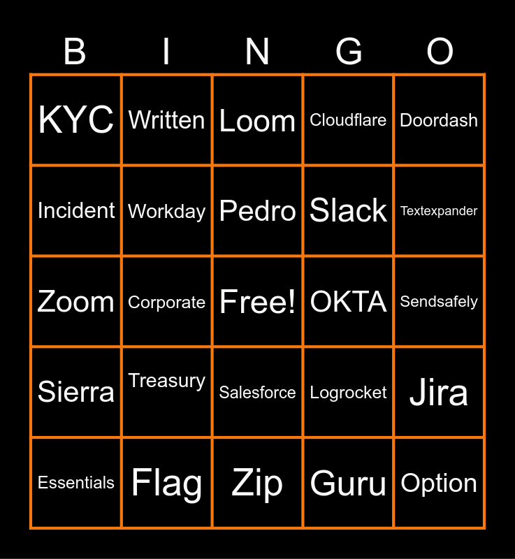 This bingo card has a free space and 24 words: Treasury, Flag, Pedro, Essentials, Doordash, KYC, Incident, Written, OKTA, Salesforce, Slack, Zoom, Logrocket, Jira, Workday, Guru, Sendsafely, Loom, Textexpander, Corporate, Option, Sierra, Cloudflare and Zip.