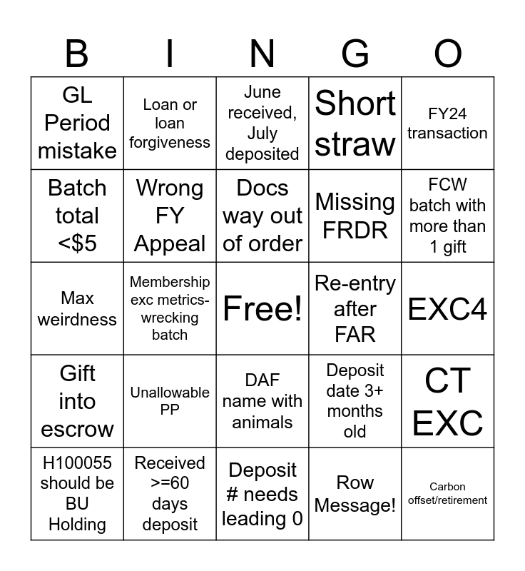 This bingo card has a free space and 31 words: Deposit # needs leading 0, Deposit # has extra leading 0, Membership exc metrics-wrecking batch, Cash Receipting Only template, GL Period mistake, June received, July deposited, Wrong FY Appeal, Deposit date 3+ months old, Re-entry after FAR, Row Message!, EXC4, Carbon offset/retirement, Super cool IK, Projected # zero, FCW batch with more than 1 gift, >5 pieces, none IRA, CT EXC, Unallowable PP, Gift into escrow, DAF name with animals, FY24 transaction, CY24 transaction, H100055 should be BU Holding, Loan or loan forgiveness, Missing FRDR, Batch total <$5, Short straw, Max weirdness, Received >=60 days deposit, Docs way out of order and Period 13 mistake.