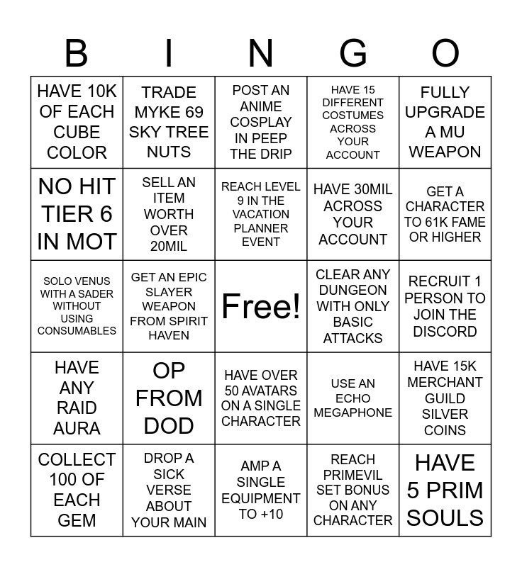 This bingo card has a free space and 25 words: OP FROM DOD, AMP A SINGLE EQUIPMENT TO +10, REACH LEVEL 9 IN THE VACATION PLANNER EVENT, COLLECT 100 OF EACH GEM, FULLY UPGRADE A MU WEAPON, HAVE 10K OF EACH CUBE COLOR, NO HIT TIER 6 IN MOT, TRADE MYKE 69 SKY TREE NUTS, CLEAR ANY DUNGEON WITH ONLY BASIC ATTACKS, HAVE OVER 50 AVATARS ON A SINGLE CHARACTER, HAVE 30MIL ACROSS YOUR ACCOUNT, SOLO VENUS WITH A SADER WITHOUT USING CONSUMABLES, USE AN ECHO MEGAPHONE, HAVE 15K MERCHANT GUILD SILVER COINS, SELL AN ITEM WORTH OVER 20MIL, HAVE AT LEAST 5 SETS LEGENDARY TIER OR HIGHER, RECRUIT 1 PERSON TO JOIN THE DISCORD, POST AN ANIME COSPLAY IN PEEP THE DRIP, GET A CHARACTER TO 61K FAME OR HIGHER, GET AN EPIC SLAYER WEAPON FROM SPIRIT HAVEN, HAVE 5 PRIM SOULS, DROP A SICK VERSE ABOUT YOUR MAIN, HAVE ANY RAID AURA, HAVE 15 DIFFERENT COSTUMES ACROSS YOUR ACCOUNT and REACH PRIMEVIL SET BONUS ON ANY CHARACTER.