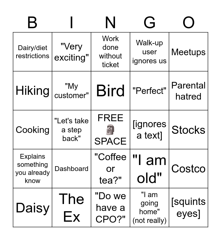 This bingo card has a free space and 24 words: Dashboard, The Ex, Bird, Daisy, Meetups, Dairy/diet restrictions, Hiking, "Very exciting", [ignores a text], "Coffee or tea?", "Perfect", Cooking, "I am old", Costco, "My customer", "I am going home" (not really), Stocks, Work done without ticket, Parental hatred, "Let's take a step back", [squints eyes], Explains something you already know, Walk-up user ignores us and "Do we have a CPO?".