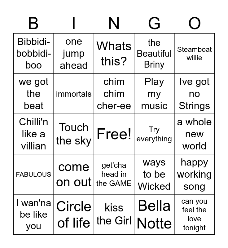 This bingo card has a free space and 29 words: I wan'na be like you, when will my life begin, Touch the sky, You're Welcome, Bibbidi-bobbidi-boo, Whats this?, immortals, come on out, Try everything, Circle of life, a whole new world, can you feel the love tonight, kiss the Girl, Bella Notte, Ive got no Strings, in summer, get'cha head in the GAME, FABULOUS, Steamboat willie, Chilli'n like a villian, ways to be Wicked, Star wars(main theme), Play my music, we got the beat, the Beautiful Briny, one jump ahead, happy working song, chim chim cher-ee and Eating the peach.
