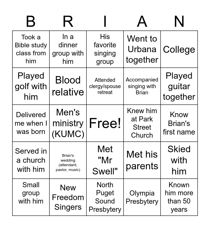 This bingo card has a free space and 24 words: Brian's wedding (attendant, pastor, music), New Freedom Singers, Attended clergy/spouse retreat, Small group with him, College, Took a Bible study class from him, Played golf with him, In a dinner group with him, Knew him at Park Street Church, Met "Mr Swell", Accompanied singing with Brian, Delivered me when I was born, Met his parents, Skied with him, Blood relative, Olympia Presbytery, Know Brian's first name, His favorite singing group, Played guitar together, Men's ministry (KUMC), Known him more than 50 years, Served in a church with him, Went to Urbana together and North Puget Sound Presbytery.