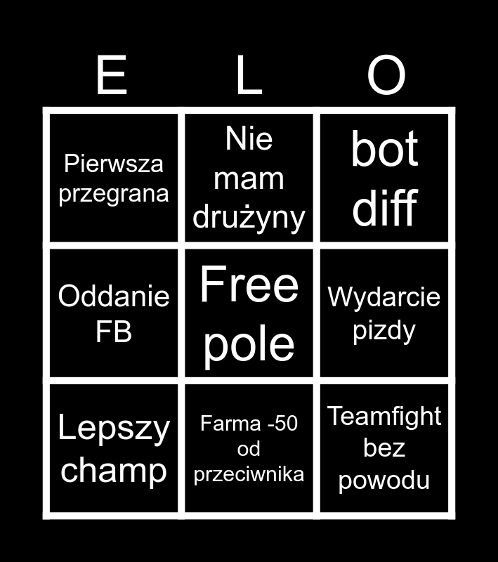 This bingo card has a free space and 8 words: Oddanie FB, Nie mam drużyny, Wydarcie pizdy, Lepszy champ, bot diff, Pierwsza przegrana, Farma -50 od przeciwnika and Teamfight bez powodu.