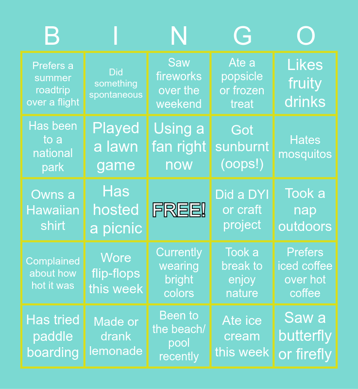This bingo card has a free space and 24 words: Wore flip-flops this week, Made or drank lemonade, Using a fan right now, Has tried paddle boarding, Likes fruity drinks, Prefers a summer roadtrip over a flight, Has been to a national park, Did something spontaneous, Did a DYI or craft project, Currently wearing bright colors, Got sunburnt (oops!), Owns a Hawaiian shirt, Took a break to enjoy nature, Prefers iced coffee over hot coffee, Played a lawn game, Ate ice cream this week, Took a nap outdoors, Saw fireworks over the weekend, Hates mosquitos, Has hosted a picnic, Saw a butterfly or firefly, Complained about how hot it was, Ate a popsicle or frozen treat and Been to the beach/ pool recently.