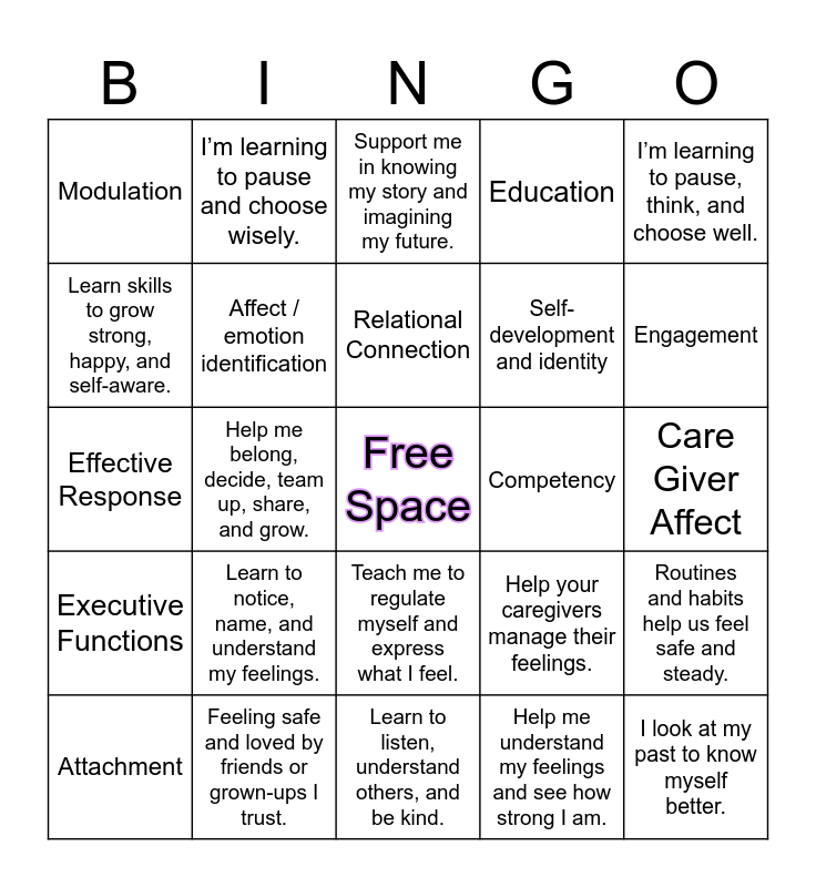This bingo card has a free space and 30 words: Feeling safe and loved by friends or grown-ups I trust., Routines and Rhythms, Help me belong, decide, team up, share, and grow., Help caregivers respond with kindness and fairness., Modulation, Support me in knowing my story and imagining my future., Affect / emotion identification, Teach me to regulate myself and express what I feel., Competency, Learn to listen, understand others, and be kind., Care Giver Affect, I look at my past to know myself better., Help me understand my feelings and see how strong I am., Regulation, Engagement, I share my feelings and listen to others to understand each other., Help your caregivers manage their feelings., Executive Functions, Learn to notice, name, and understand my feelings., I’m learning to pause, think, and choose well., Effective Response, Attunement, I’m learning to pause and choose wisely., Self- development and identity, Learn skills to grow strong, happy, and self-aware., Education, Routines and habits help us feel safe and steady., Attachment, Relational Connection and Trauma Experience Integration.