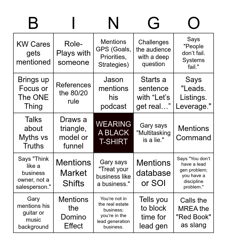 This bingo card has a free space and 24 words: Mentions Market Shifts, Mentions the Domino Effect, Jason mentions his podcast, Gary mentions his guitar or music background, Says "People don’t fail. Systems fail.", KW Cares gets mentioned, Brings up Focus or The ONE Thing, Role-Plays with someone, Gary says "Multitasking is a lie.", Gary says "Treat your business like a business.", Starts a sentence with “Let’s get real…”, Talks about Myths vs Truths, Mentions database or SOI, Says "You don’t have a lead gen problem; you have a discipline problem.", References the 80/20 rule, Tells you to block time for lead gen, Mentions Command, Mentions GPS (Goals, Priorities, Strategies), Says "Leads. Listings. Leverage.", Draws a triangle, model or funnel, Calls the MREA the "Red Book" as slang, Says "Think like a business owner, not a salesperson.", Challenges the audience with a deep question and You’re not in the real estate business; you’re in the lead generation business..
