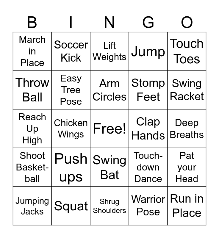 This bingo card has a free space and 24 words: Push ups, Squat, Arm Circles, Jumping Jacks, Touch Toes, March in Place, Throw Ball, Soccer Kick, Clap Hands, Swing Bat, Stomp Feet, Reach Up High, Touch-down Dance, Pat your Head, Easy Tree Pose, Warrior Pose, Deep Breaths, Lift Weights, Swing Racket, Chicken Wings, Run in Place, Shoot Basket-ball, Jump and Shrug Shoulders.