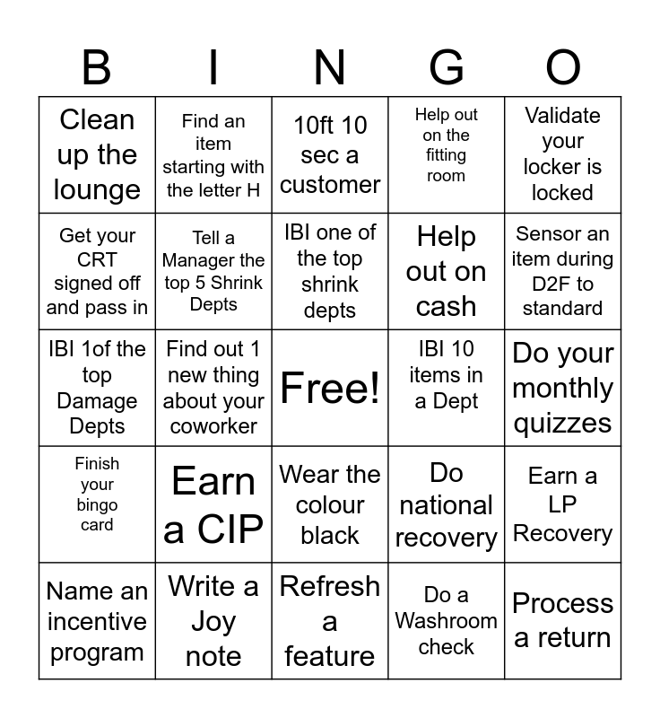 This bingo card has a free space and 24 words: Earn a CIP, Write a Joy note, IBI one of the top shrink depts, Name an incentive program, Validate your locker is locked, Clean up the lounge, Get your CRT signed off and pass in, Find an item starting with the letter H, IBI 10 items in a Dept, Wear the colour black, Help out on cash, IBI 1of the top Damage Depts, Do national recovery, Earn a LP Recovery, Tell a Manager the top 5 Shrink Depts, Do a Washroom check, Do your monthly quizzes, 10ft 10 sec a customer, Sensor an item during D2F to standard, Find out 1 new thing about your coworker, Process a return, Finish your bingo card, Help out on the fitting room and Refresh a feature.