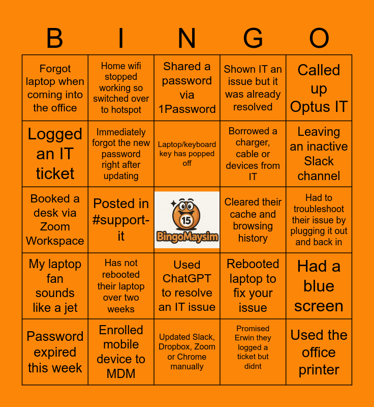 This bingo card has a free space and 24 words: Has not rebooted their laptop over two weeks, Enrolled mobile device to MDM, Laptop/keyboard key has popped off, Password expired this week, Called up Optus IT, Forgot laptop when coming into the office, Logged an IT ticket, Home wifi stopped working so switched over to hotspot, Cleared their cache and browsing history, Used ChatGPT to resolve an IT issue, Borrowed a charger, cable or devices from IT, Booked a desk via Zoom Workspace, Rebooted laptop to fix your issue, Had a blue screen, Immediately forgot the new password right after updating, Promised Erwin they logged a ticket but didnt, Had to troubleshoot their issue by plugging it out and back in, Shared a password via 1Password, Leaving an inactive Slack channel, Posted in #support-it, Used the office printer, My laptop fan sounds like a jet, Shown IT an issue but it was already resolved and Updated Slack, Dropbox, Zoom or Chrome manually.