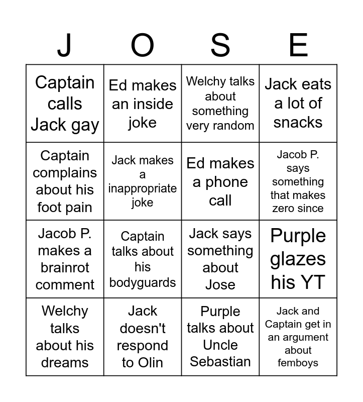 This bingo card has 24 words: Jacob P. talks about Survivor, Jacob P. drinks Cheerwine, Jacob P. says something that makes zero since, Welchy mentions the shark, Captain complains about his foot pain, Captain calls Jack gay, Jack makes a inappropriate joke, Ed makes an inside joke, Jack doesn't respond to Olin, Jack makes a Linkin Park reference, Jacob P. makes a brainrot comment, Jack says something about Jose, Captain eats something insane at a meal, Welchy talks about his music, Ed makes a phone call, Jack talks about the radios, Purple talks about Uncle Sebastian, Welchy talks about something very random, Captain talks about his bodyguards, Purple glazes his YT, Welchy talks about his dreams, Jack and Captain get in an argument about femboys, Jack eats a lot of snacks and Captain talks about the shark.