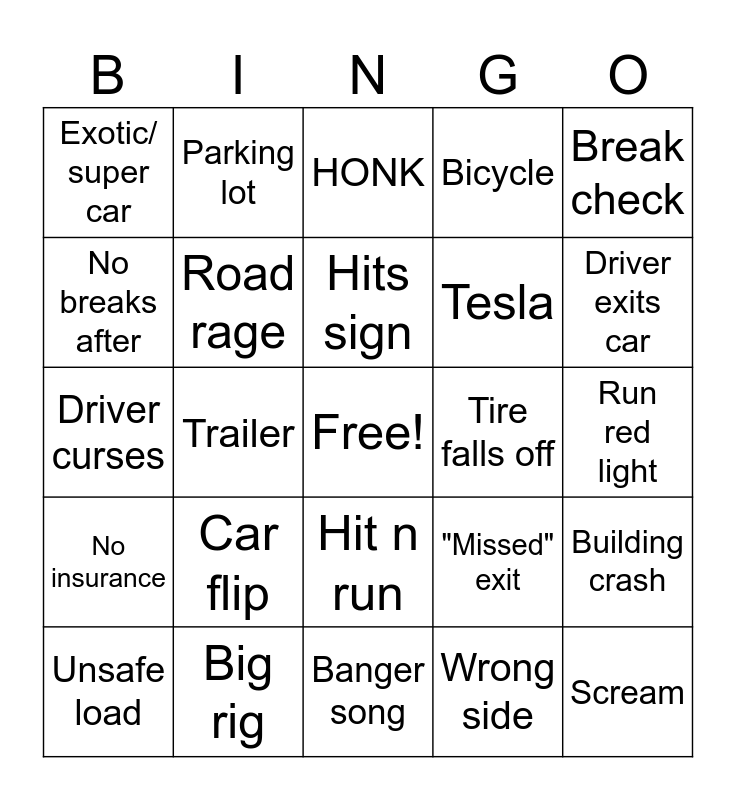 This bingo card has a free space and 29 words: Unsafe load, Snowy road, Trailer, Totaled, Exotic/ super car, HONK, Road rage, Car flip, Tire falls off, Big rig, Run red light, Scream, Banger song, Wrong side, Driver exits car, Cops show up, Hit n run, No insurance, Break check, Driver curses, "Missed" exit, Cyber truck, Tesla, No breaks after, Bicycle, Parking lot, Building crash, Hits sign and Hits median.