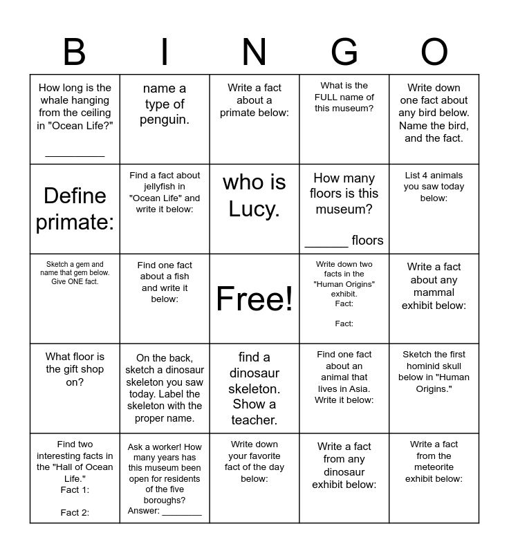 This bingo card has a free space and 24 words: On the back, sketch a dinosaur skeleton you saw today. Label the skeleton with the proper name., Ask a worker! How many years has this museum been open for residents of the five boroughs? Answer: ________, who is Lucy., Find two interesting facts in the "Hall of Ocean Life." Fact 1: Fact 2:, Write down one fact about any bird below. Name the bird, and the fact., How long is the whale hanging from the ceiling in "Ocean Life?" __________, Define primate:, name a type of penguin., Write down two facts in the "Human Origins" exhibit. Fact: Fact:, find a dinosaur skeleton. Show a teacher., How many floors is this museum? ______ floors, Sketch a gem and name that gem below. Give ONE fact., Find one fact about an animal that lives in Asia. Write it below:, Sketch the first hominid skull below in "Human Origins.", Find a fact about jellyfish in "Ocean Life" and write it below:, Write a fact from any dinosaur exhibit below:, Write a fact about any mammal exhibit below:, Write a fact about a primate below:, List 4 animals you saw today below:, Find one fact about a fish and write it below:, Write a fact from the meteorite exhibit below:, What floor is the gift shop on?, What is the FULL name of this museum? and Write down your favorite fact of the day below:.