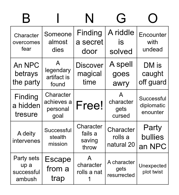 This bingo card has a free space and 24 words: Successful stealth mission, Escape from a trap, Discover magical time, Party sets up a successful ambush, Encounter with undead, Character overcomes fear, An NPC betrays the party, Someone almost dies, A character gets cursed, Character fails a saving throw, A spell goes awry, Finding a hidden tresure, Character rolls a natural 20, Party bullies an NPC, A legendary artifact is found, A character gets resurrected, Successful diplomatic enounter, Finding a secret door, DM is caught off guard, Character achieves a personal goal, Unexpected plot twist, A deity intervenes, A riddle is solved and A character rolls a nat 1.