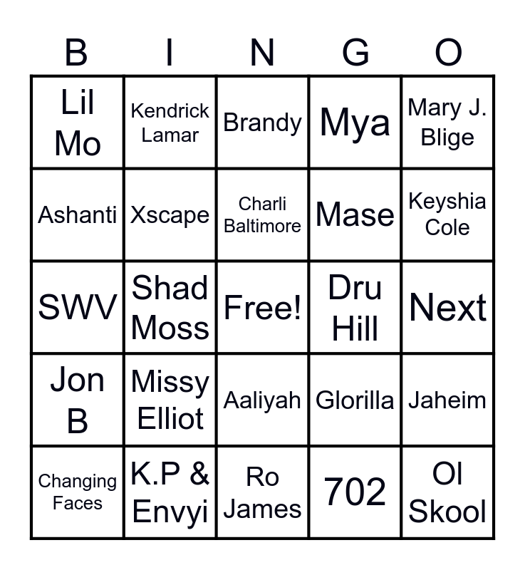This bingo card has a free space and 25 words: Changing Faces, Missy Elliot, Charli Baltimore, 702, Keyshia Cole, Lil Mo, Kendrick Lamar, Brandy, Mase, Jaheim, SWV, Xscape, Glorilla, Ol Skool, Ashanti, K.P & Envyi, Ro James, Mya, Next, Jon B, Shad Moss, Aaliyah, Dru Hill, Mary J. Blige and Silk.