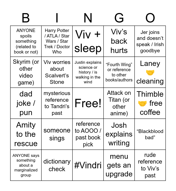 This bingo card has a free space and 24 words: someone sings, dictionary check, Justin explains science or history / is walking in the wind, ANYONE says something about a marginalized group, Jer joins and doesn’t speak / Irish goodbye, ANYONE spoils something (related to book or not), Skyrim (or other video game), Harry Potter / ATLA / Star Wars / Star Trek / Doctor Who, Attack on Titan (or other anime), reference to AOOO / past book pick, “Fourth Wing” or reference to other books/authors, dad joke / pun, Josh explains writing, “Blackblood bad”, Viv worries about Scalvert’s Stone, menu gets an upgrade, Thimble 🤝 free coffee, Viv + sleep, Laney 🤝 cleaning, mysterious reference to Tandri’s past, rude reference to Viv’s past, Amity to the rescue, Viv’s back hurts and #Vindri.