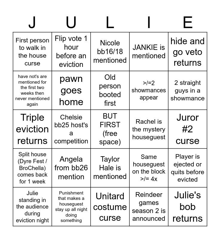 This bingo card has a free space and 24 words: Angela from bb26 mention, Punishment that makes a houseguest stay up all night doing something, Old person booted first, Julie standing in the audience during eviction night, hide and go veto returns, First person to walk in the house curse, have not's are mentioned for the first two weeks then never mentioned again, Flip vote 1 hour before an eviction, Rachel is the mystery houseguest, Taylor Hale is mentioned, >/=2 showmances appear, Triple eviction returns, Same houseguest on the block >/= 4x, Player is ejected or quits before evicted, pawn goes home, Reindeer games season 2 is announced, Juror #2 curse, Nicole bb16/18 mentioned, 2 straight guys in a showmance, Chelsie bb25 host's a competition, Julie's bob returns, Split house (Dyre Fest / BroChella) comes back for 1 week, JANKIE is mentioned and Unitard costume curse.