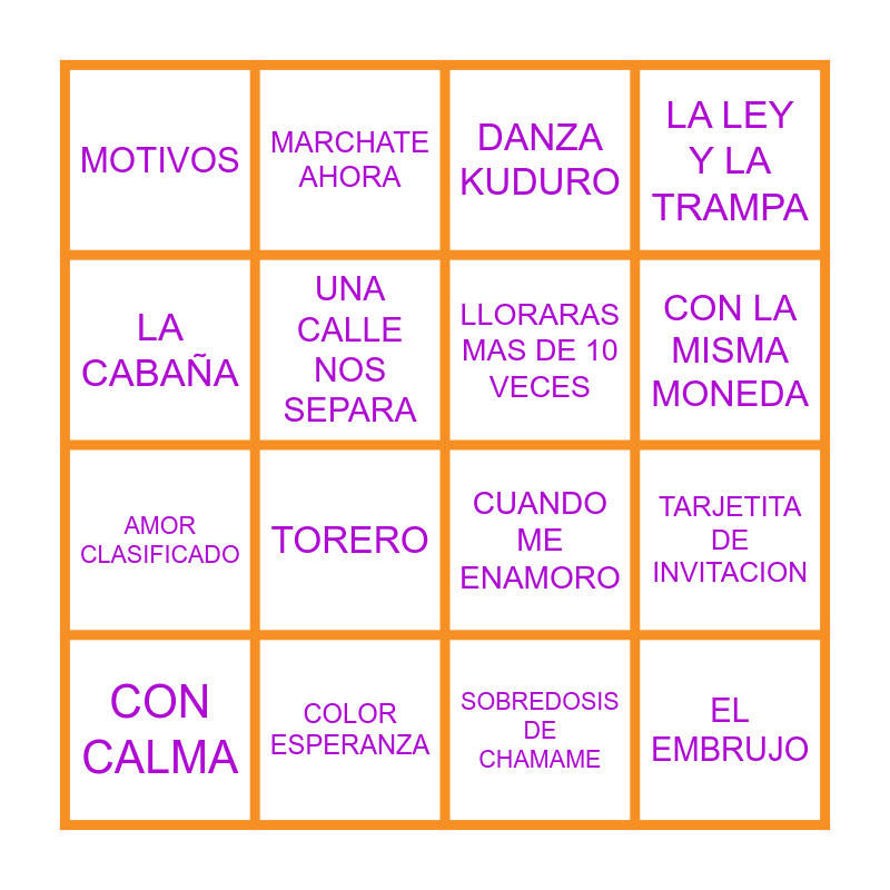 This bingo card has 20 words: TARJETITA DE INVITACION, LLAMADO DE EMERGENCIA, DANZA KUDURO, LIMBO, CON CALMA, LA CABAÑA, COLOR ESPERANZA, MOTIVOS, AMOR CLASIFICADO, MARCHATE AHORA, TORERO, CUANDO ME ENAMORO, UNA CALLE NOS SEPARA, EL EMBRUJO, LLORARAS MAS DE 10 VECES, OJITOS ROJOS, CON LA MISMA MONEDA, LA LEY Y LA TRAMPA, SOBREDOSIS DE CHAMAME and NO ME ARREPIENTO DE ESTE AMOR.