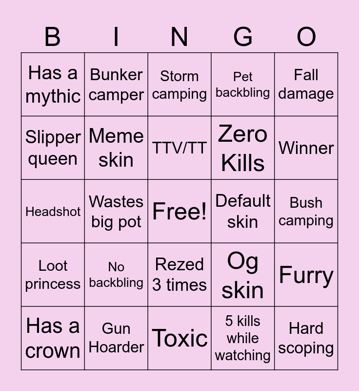 This bingo card has a free space and 29 words: Has a crown, Wearing Red, Wastes big pot, Grapple demon, Has a mythic, Storm camping, Meme skin, No backbling, Default skin, Gun Hoarder, Bush camping, Hard scoping, Toxic, 5 kills while watching, Winner, No movement, Rezed 3 times, Loot princess, Fall damage, Headshot, Og skin, BP skin, Zero Kills, Slipper queen, Pet backbling, Bunker camper, Furry, TTV/TT and Crown Win.