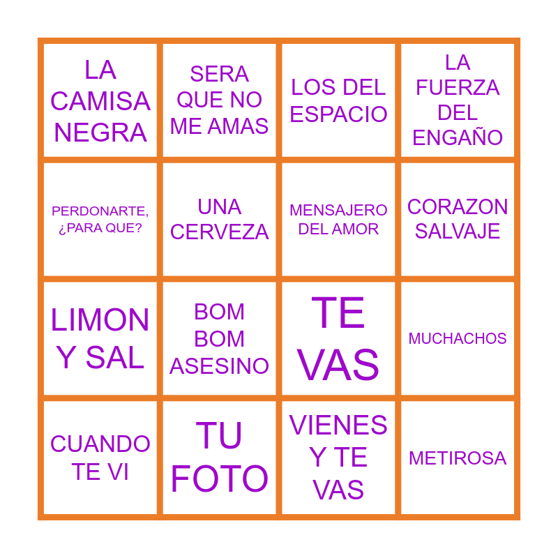 This bingo card has 20 words: MUCHACHOS, HISTORIA DE UN TAXI, LOS DEL ESPACIO, SABALERO, CUANDO TE VI, PERDONARTE, ¿PARA QUE?, TU FOTO, LA CAMISA NEGRA, LIMON Y SAL, SERA QUE NO ME AMAS, BOM BOM ASESINO, TE VAS, UNA CERVEZA, METIROSA, MENSAJERO DEL AMOR, EL TREN DEL CIELO, CORAZON SALVAJE, LA FUERZA DEL ENGAÑO, VIENES Y TE VAS and COMO HAS HECHO.