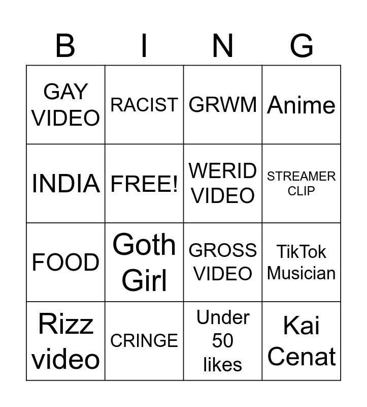 This bingo card has 25 words: OLD GUY/WOMEN, GIRL, STREAMER CLIP, FAT PERSON, INDIA, GAY VIDEO, FREE!, RACIST, CRINGE, FUNNY VIDEO, FOOD, GROSS VIDEO, EDIT, Dance, WERID VIDEO, Money give away / Challenge, Under 50 likes, GRWM, Goth Girl, TikTok Musician, Rizz video, Caseoh, Kai Cenat, Anime and Edit.
