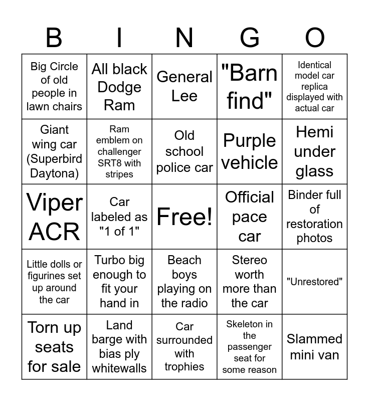 This bingo card has a free space and 31 words: Car surrounded with trophies, Hellcat swapped something, Car labeled as "1 of 1", Pink vehicle, Big Circle of old people in lawn chairs, General Lee, Ram emblem on challenger SRT8 with stripes, Stereo worth more than the car, Official pace car, Skeleton in the passenger seat for some reason, Binder full of restoration photos, Slammed mini van, Spec sheets printed out and laminated, Plymouth Prowler with matching trailer, Hemi under glass, TC by Maserati, "Unrestored", Turbo big enough to fit your hand in, Little dolls or figurines set up around the car, Beach boys playing on the radio, Identical model car replica displayed with actual car, Lil Red Express, Torn up seats for sale, All black Dodge Ram, Purple vehicle, Giant wing car (Superbird Daytona), "Barn find", Viper ACR, Land barge with bias ply whitewalls, Old school police car and Neon SRT4.