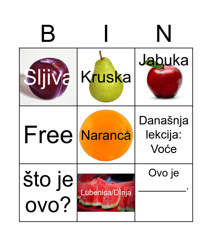 This bingo card has 4 images, a free space and 8 words: Današnja lekcija: Voće, Jabuka, Kruska, što je ovo?, Sljiva, Ovo je ________., Free and Lubenica/DInja.
