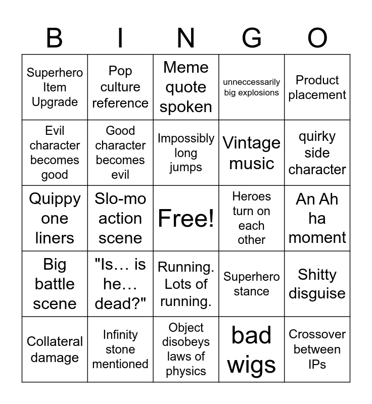 This bingo card has a free space and 24 words: "Is… is he… dead?", Infinity stone mentioned, Impossibly long jumps, Collateral damage, Product placement, Superhero Item Upgrade, Evil character becomes good, Pop culture reference, Heroes turn on each other, Running. Lots of running., Vintage music, Quippy one liners, Superhero stance, Shitty disguise, Good character becomes evil, bad wigs, An Ah ha moment, Meme quote spoken, quirky side character, Slo-mo action scene, Crossover between IPs, Big battle scene, unneccessarily big explosions and Object disobeys laws of physics.